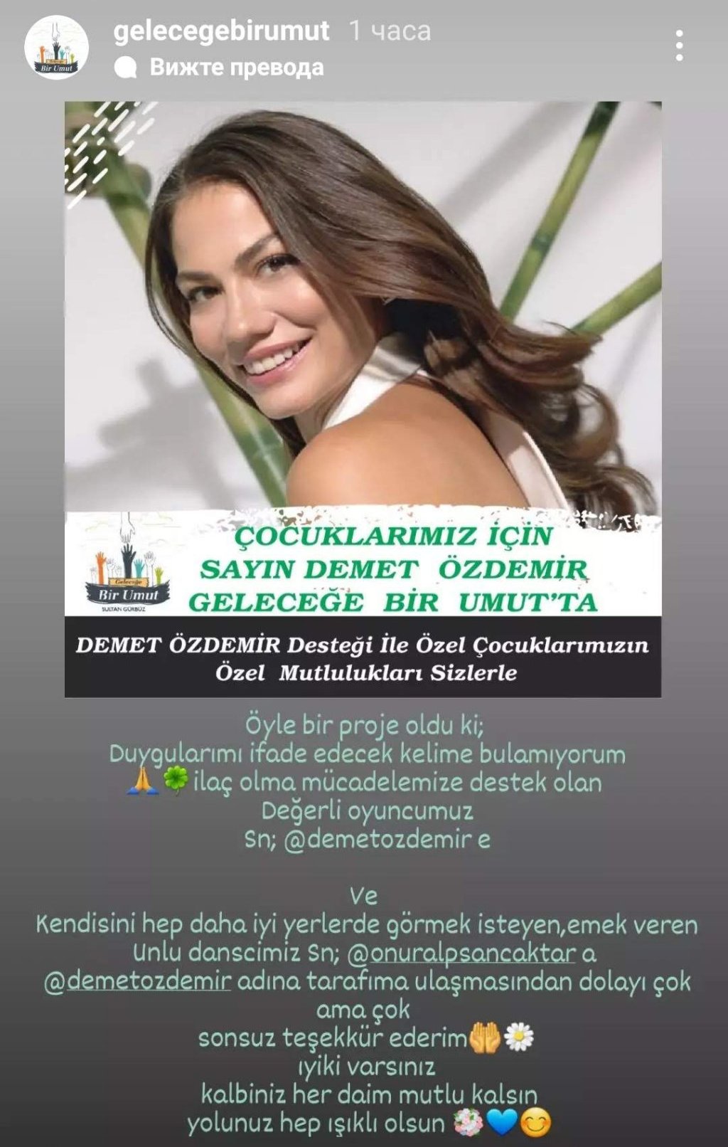Благодарности от фондация "Надежда за бъдещето", която по обяд ще обяви проект, в който Демет и Онур Алп са се включили. Доколкото разбирам е свързан с деца със специални потребности.