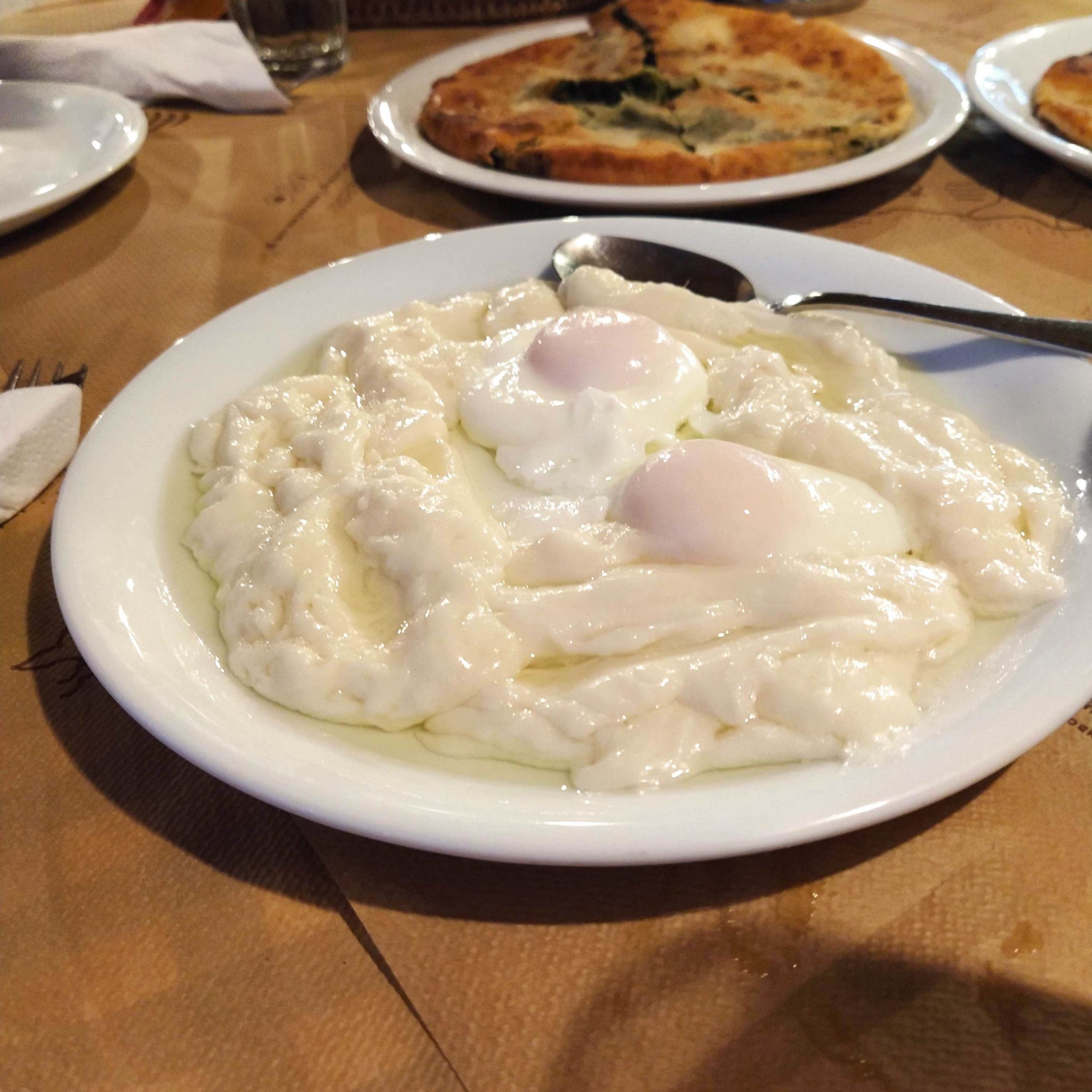 Стака/staka, можете да си поръчате с яйца или без. Уникално вкусно нещо, това е каймак/масло, в което се запържва лъжица брашно.