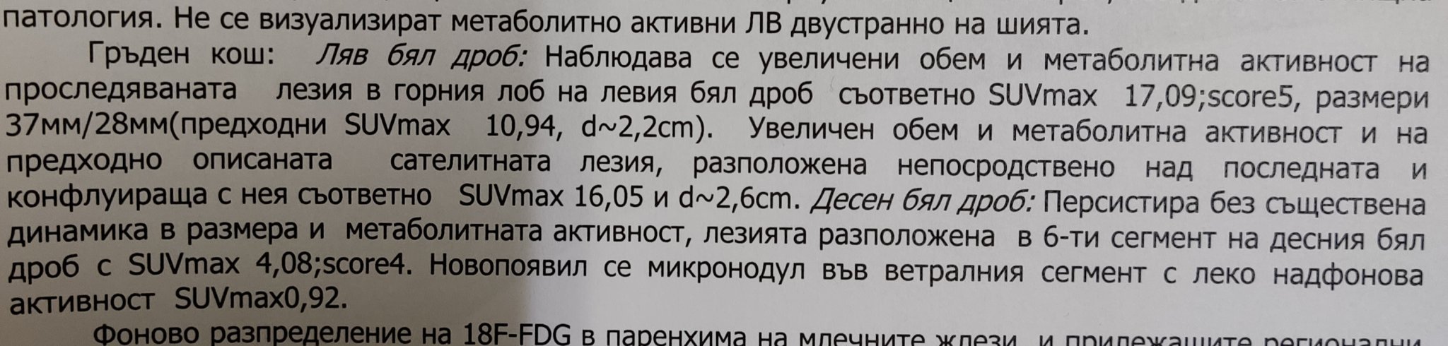 Голямото (основната лезия) уж се беше повлияло от лъчето на 3 месец, но на 6 месец се появи над него сателитна лезия, която не реагира на химията за разлика от него. Основната лезия се повлия от платината, но след като я спряха поради токсичност, започна да расте и си достига размерите отпреди лъчетерапията.