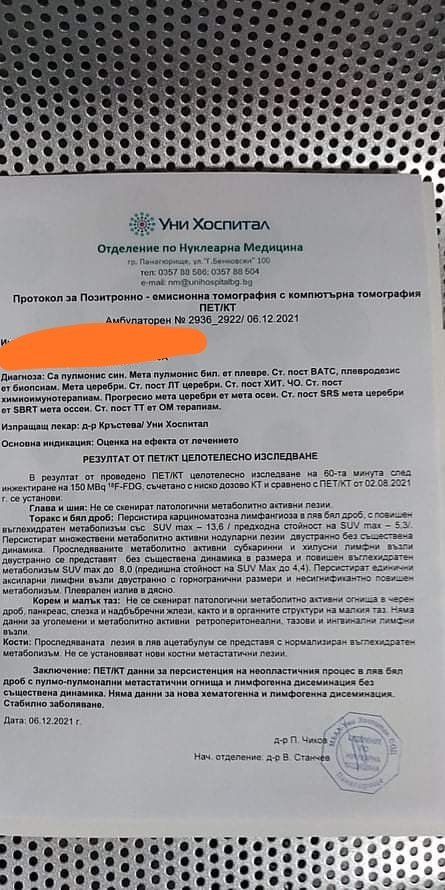 Минала е Кръстева,казала е ,че нещата в белия дроб са нормални ,нищо притеснително  кой знае какво,но трябва да се види ямр и тогава да кажат как ще продължи лечението...То какво друго лечение на мозъка,може би добавяне на ХТ!?