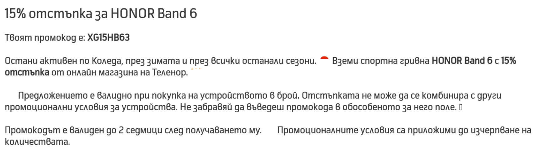 Код за 15% отстъпка за HONOR Band 6 в онлайн магазина на Telenor