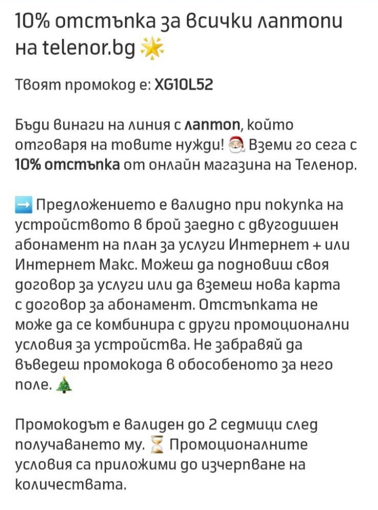 Код за 10% отстъпка за всички лаптопи в Telenor.bg