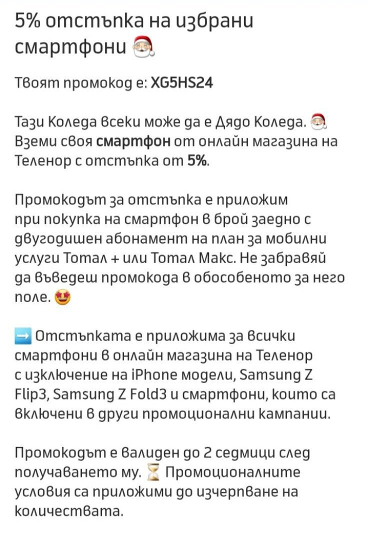 Код за 5% отстъпка на избрани смартфони в онлайн магазина на Telenor