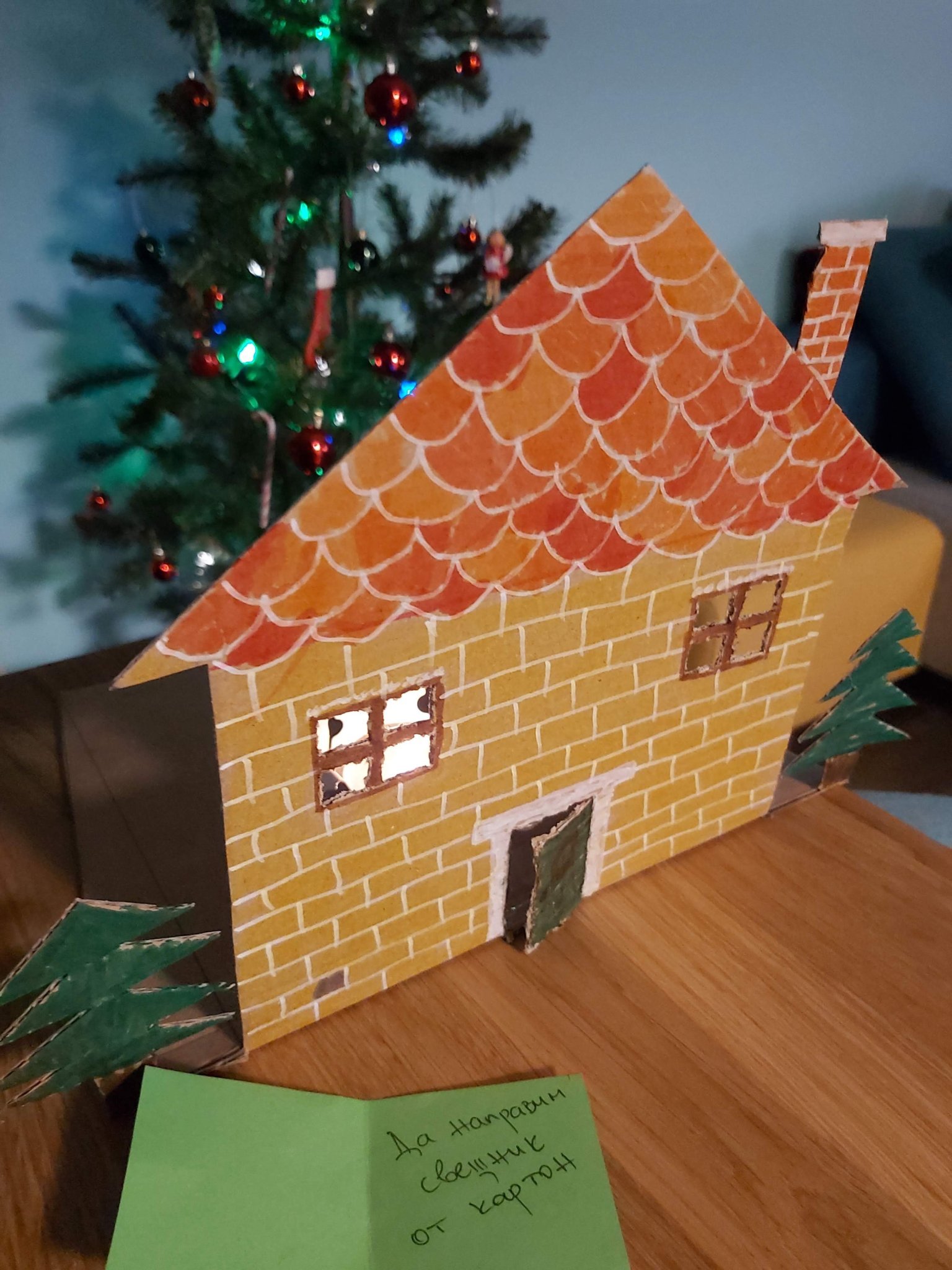 Всичко си го правим сами. Има дървен адвент календар тип къщичка с прозорчета. Във всяко прозорче слагам разпечатано листче, много често написано в стихотворна форма и картинка, на което има или загадка или упътване към място, на което се намира загадката(ако е по-описателна и не мога да я събера на малко листче). Слагам и бонбонче. Загадките са от най-различен тип. Винаги са били съобразени с това, което учи и знае към момента.