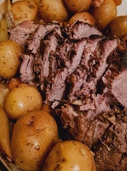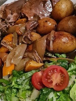 Вечерята беше телешко с картофи, лук и моркови.