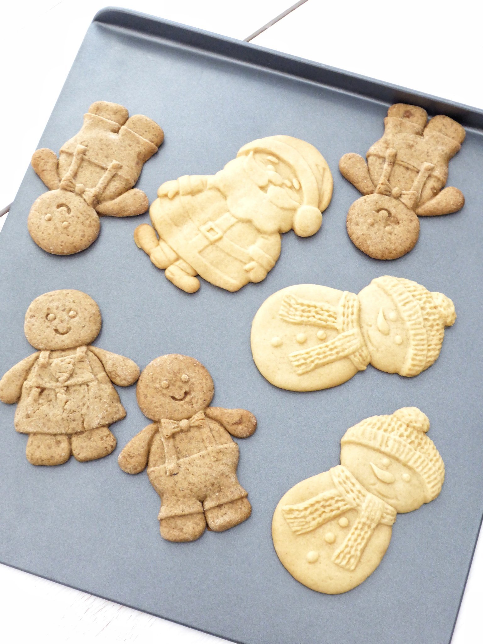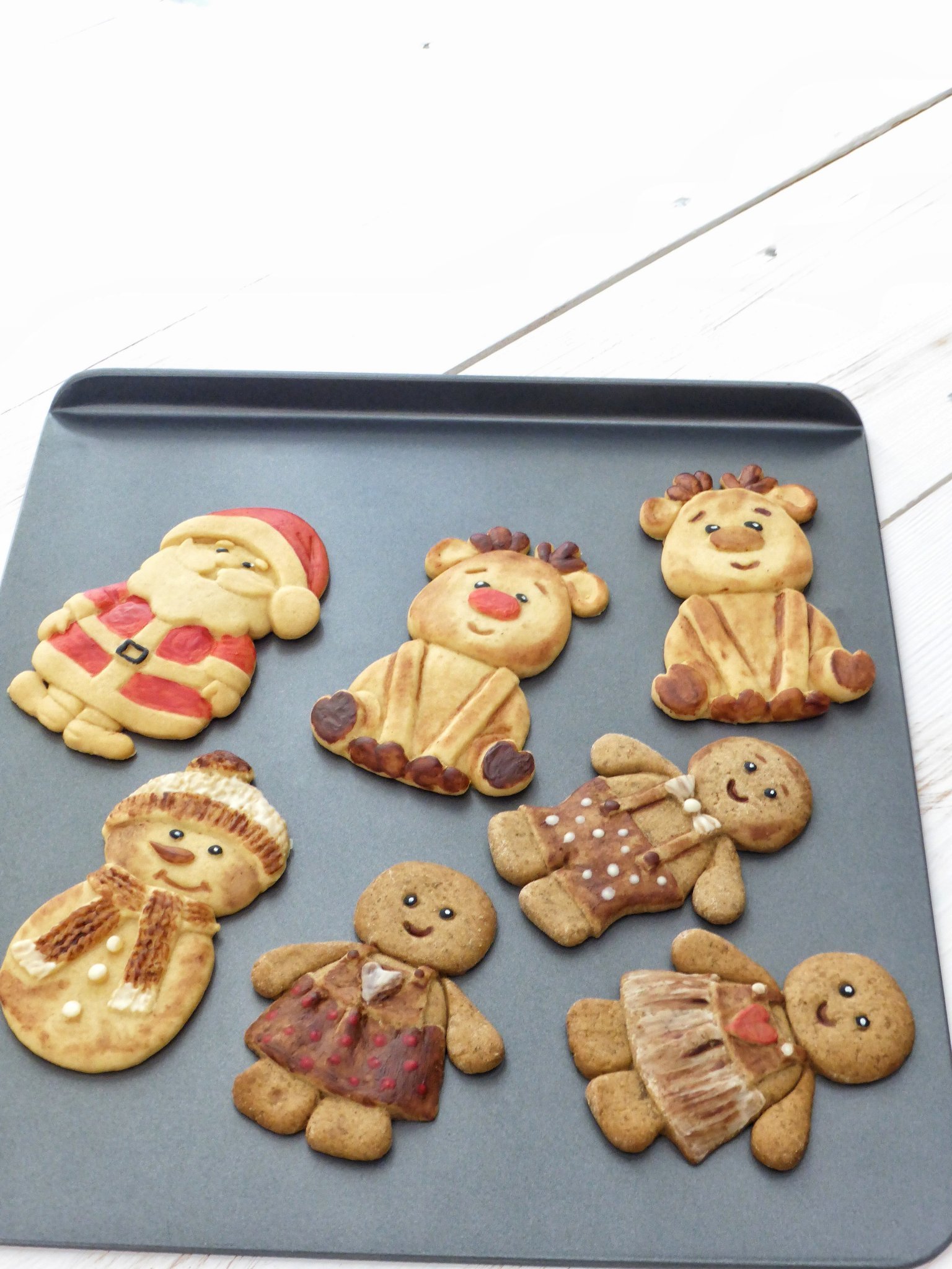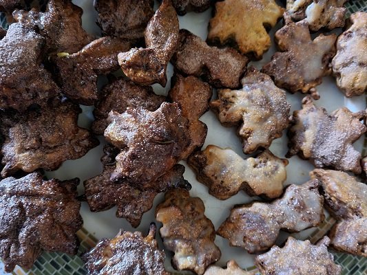Накрая се разточва 5мм дебелина, режат се форми и се пекат към 6-8мин на 180С, много бързо стават, леко се надуват, не се уголемяват много. Излязоха две тави. Отгоре още топли са наръсени с портокалов сок от другата половинка портокал, мацнах го с четка, и са глазирани с гъста смес от вода и пудра захар, накрая са напудрени с какао и още малко захар.