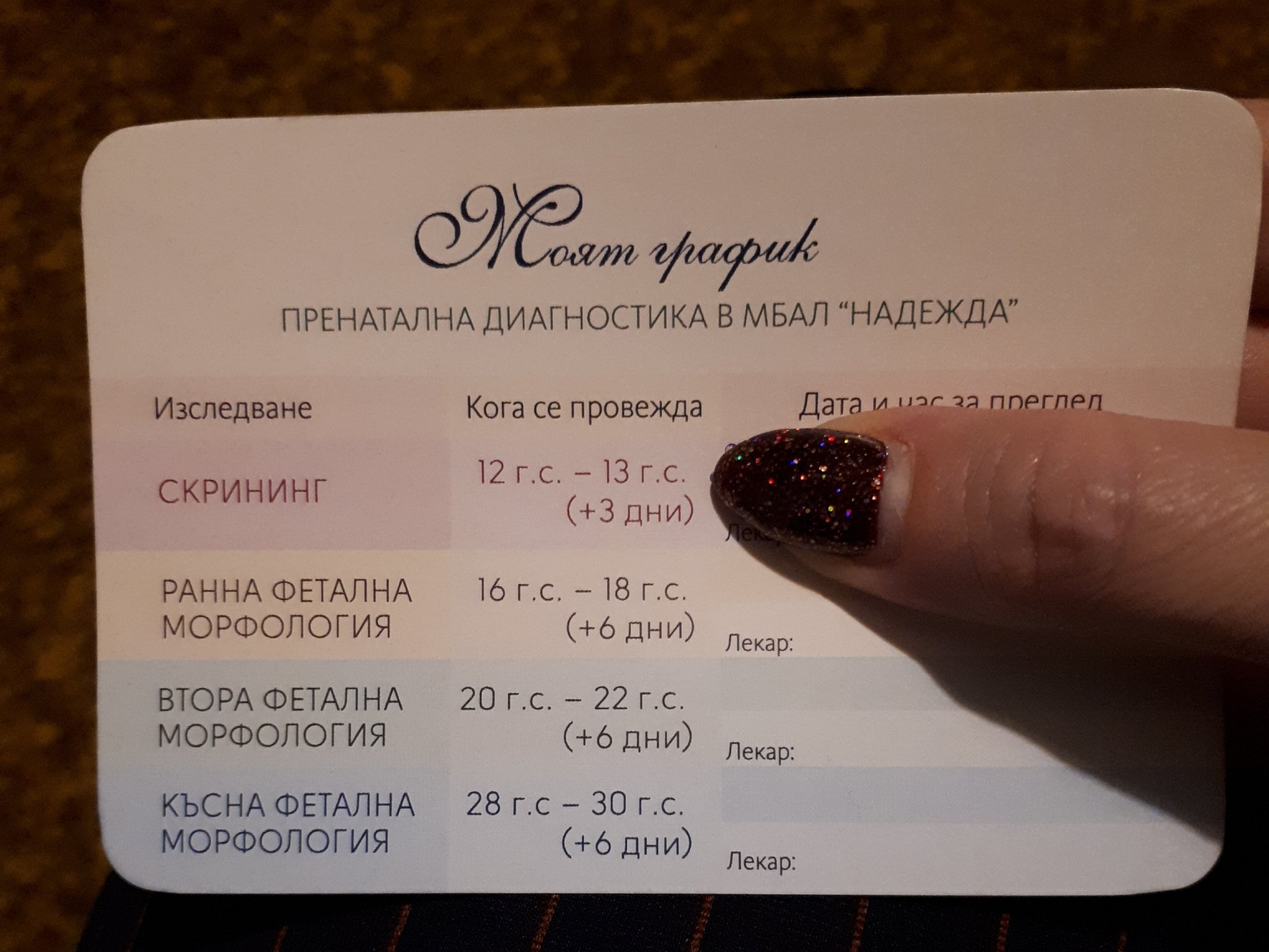 В Надежда, скрийнинг е БХС и ФМ, аз съм при д-р Панайотова,  и това да били най - приятните и полозотворни прегледи поне 40мин и обстоен преглед поне по два пъти на всеки орган. Сега ми остава само доплер в 35гс. При мен не е наложителн, но аз искам да отида заради лекарката и да съм спокойна!
