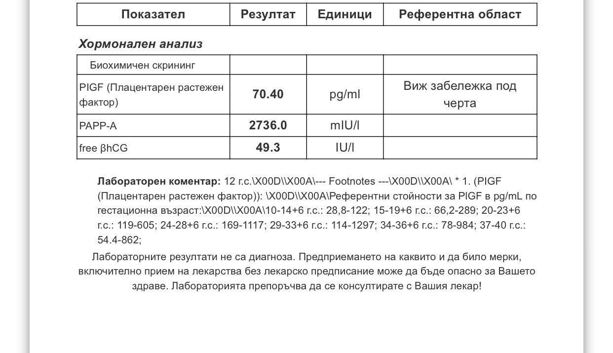 ( гр.София)  в 11 г.с дадох кръв за изследванията, но когато минах на преглед с видеозон те още не бяха готови и лекъря ми каза виж си ги в интернет ако има нещо ще се обадя аз не ги разбирам не съм от там  той така и не звънна и много ще се радвам ако някоя от вас ми помогне със разчитането им (каза ми че със плода всичко е наред но мен ми е притеснено дали и изследванията са ОК) ако някоя е имала подобни стойности много ще се радвам да ми сподели мение целувки