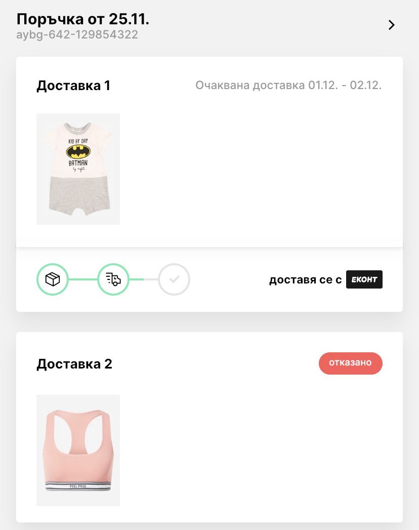 AboutYou.bg предлага безплатна доставка и връщане на дрехи, обувки и аксесоари от над 2000 марки. Връщането може да бъде извършено до 100 дни след получаване на поръчката; могат да бъдат върнати както всички артикули от една поръчка, така и само част от тях. При връщане на продукти в AboutYou.bg клиентите могат да използват същия плик от магазина или да използват свой собствен опаковъчен материал. Ако са загубили документа за връщане, те могат да генерират нов такъв в своя профил на платформата. Освен това, самият уебсайт има раздела „Поръчки“, където има бутон за връщане на артикул. Клиентите могат да изберат артикулите, които искат да върнат, и да генерират нов документ за връщане и за транспорт.