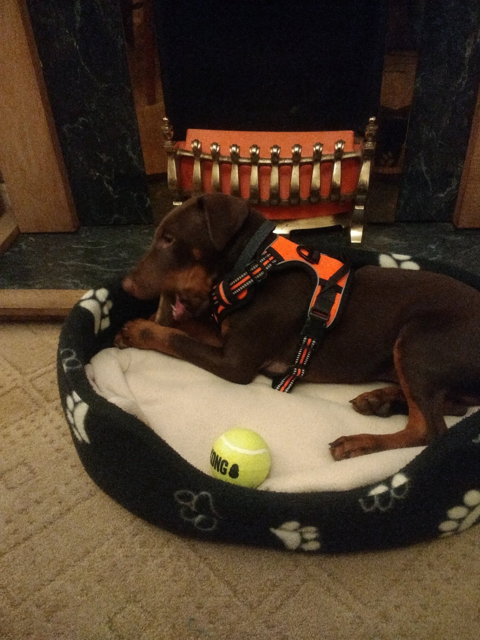Дойде поръчката на Шоколада - нов нагръдник, че стария му умаля - точно като човешките бебета Laughing
