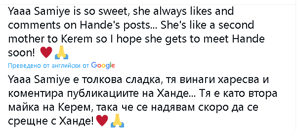 Вече всички знаем тази прекрасна снимка на Ханде. Мама Чийдем е показала колко много я обича. Но има нещо много интересно. Тази снимка е лайкнала и Самие Ардич. Тя е нещо като втора майка на Керем. Една от най-добрите приятелки на майка му. Тя също е харесала и коментирала публикацията на Ханде.