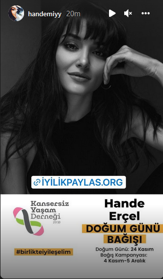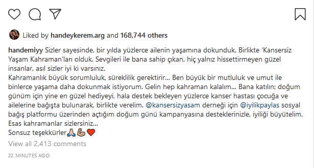 Героизмът изисква голяма отговорност и приемственост... Искам да докосна още хиляди животи с голямо щастие и надежда. Нека винаги бъдем герои... Присъединете се към мен. Нека направим заедно най-добрия подарък за рождения ми ден, като дарим на стотици деца с рак и техните семейства, които все още чакат подкрепа. Нека увеличим доброто с вашата подкрепа за кампанията за рожден ден, която открих за асоциацията @kansersizyasam чрез платформата за социални дарения @iyilikpaylas.