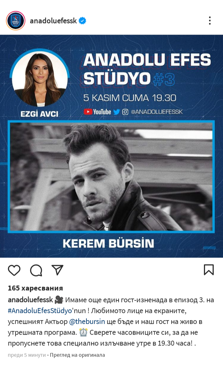 Епизодът на предаването, в който ще участва Керем, ще се излъчва на живо в канала на спортния клуб Анадолу Ефес от 19:30ч. Линк към него:https://youtube.com/c/AnadoluEfesSK