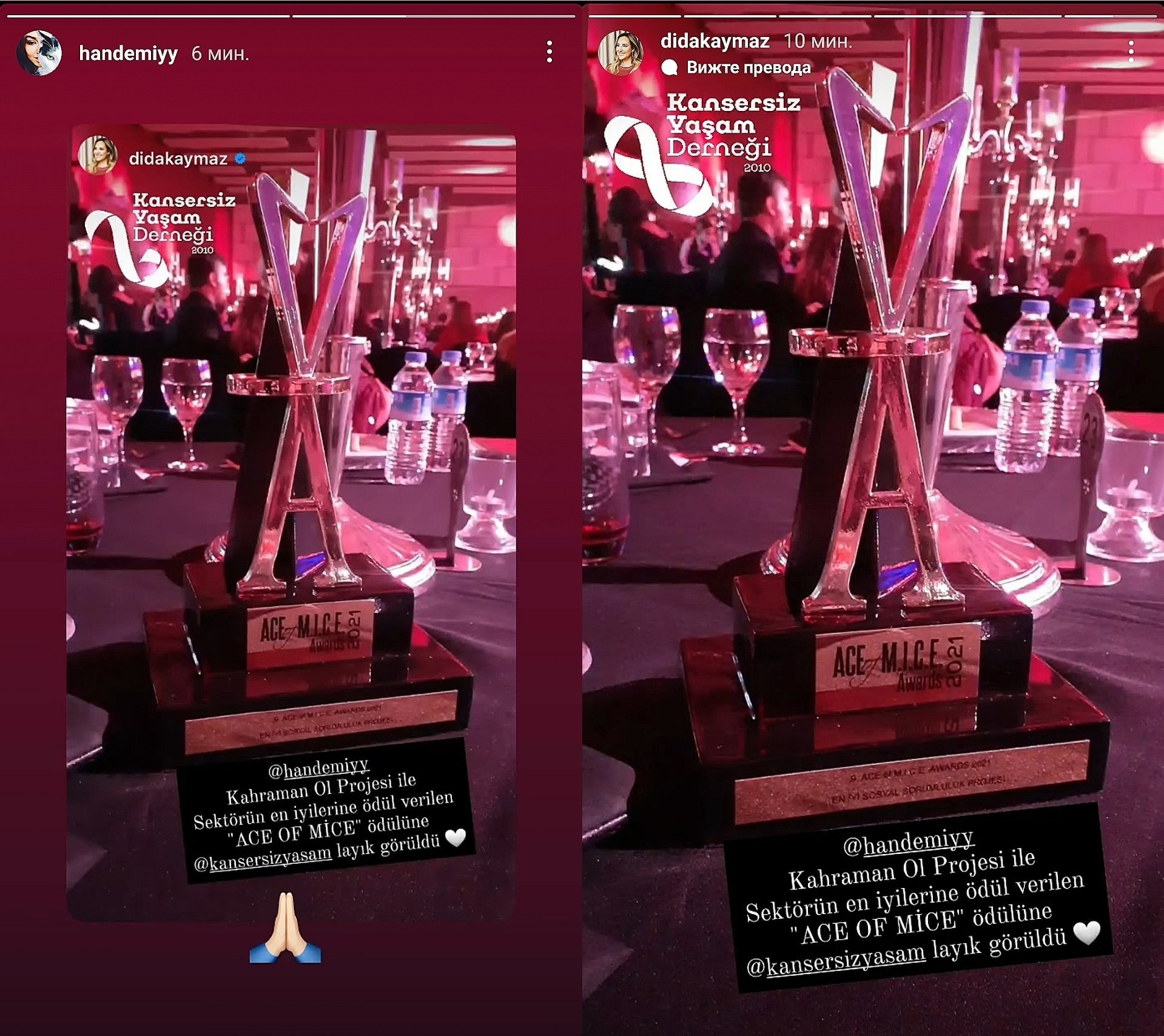 "Асоциация за живот без рак" на 9-ите награди ACE of MICE, където се награждават най-добрите в бранша. Проектът на Ханде беше определен за достоен за наградата „Най-добър проект за социална отговорност“ с кампанията „Бъди герой“,