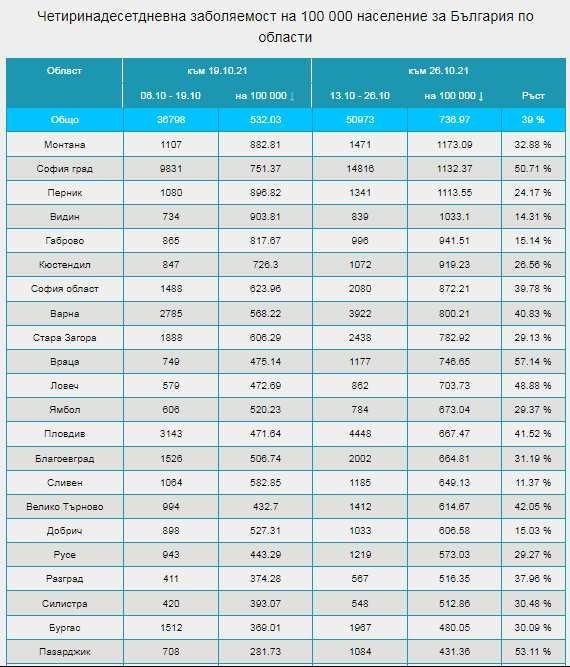 Четиринадесетдневна заболяемост на 100 000 души вече се мери с четирицифрени числа, в София - ръст 50% за седмица.