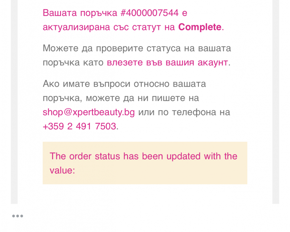 Вашата поръчка #4000007ХХХХ е актуализирана със статут на Complete.