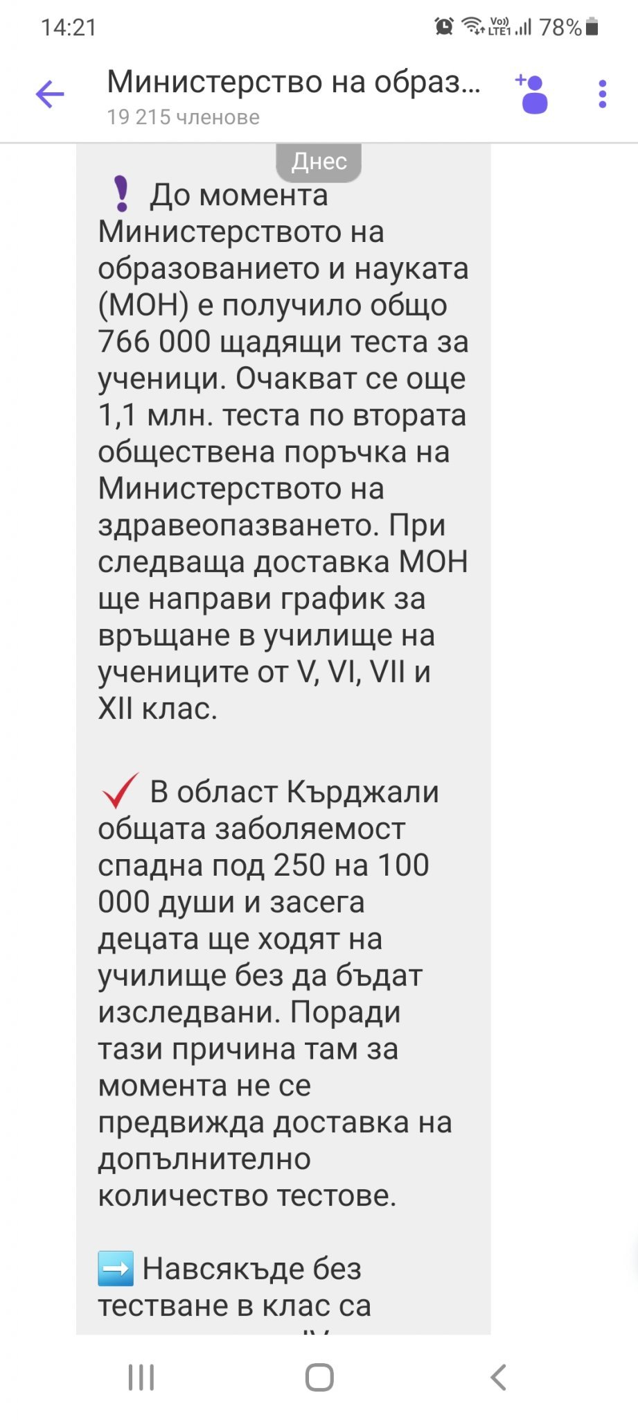 Текстовете са обединени в един: „Формулярът съдържа разногласия относно тестването на учениците в училище. Някои участници поставят под въпрос ефективността на тестовете, като изразяват опасениния относно потенциални злоупотреби и неточни резултати. Други се противопоставят на идеята за тестуване в училище, като изразяват съмнения относно способността за правилно изпълнение на процедурата и справедливост към учениците. Освен това има разочарование от решенията на управляващите, тъй като се изразява съмнение дали тестовете могат да бъдат ефективно контролирани. Участниците изразяват недоволство и критики към управлението за липсата на ясна стратегия и осигуряване на тестове за учениците. Изразена е загриженост за здравето на децата и се подчертава необходимостта от тестването им, преди да се върнат в училище.“