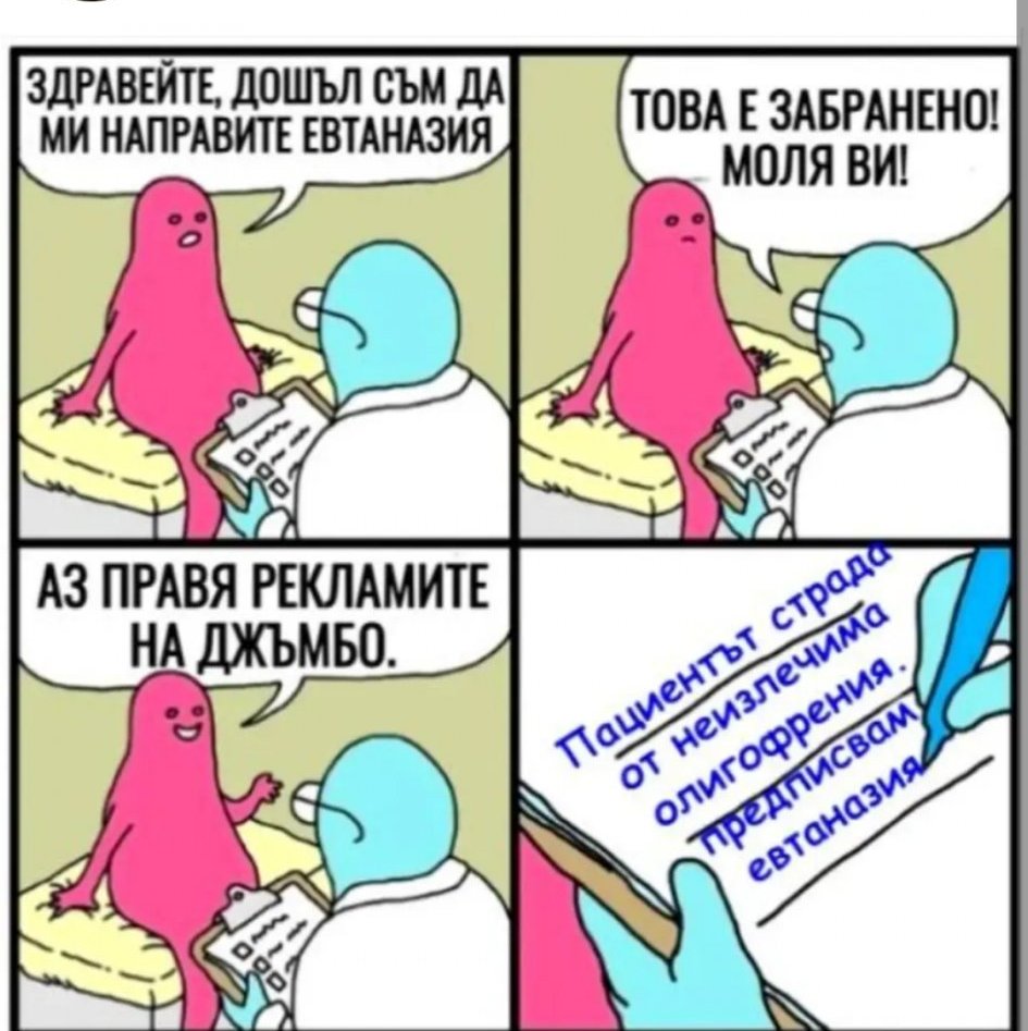 Докато върви тая реклама на Джъмбо ми е все едно имам автоматичен пистолет и на всяка дума "Джъмбо" произвеждам по 1 изстрел в телевизора Sweat Smile