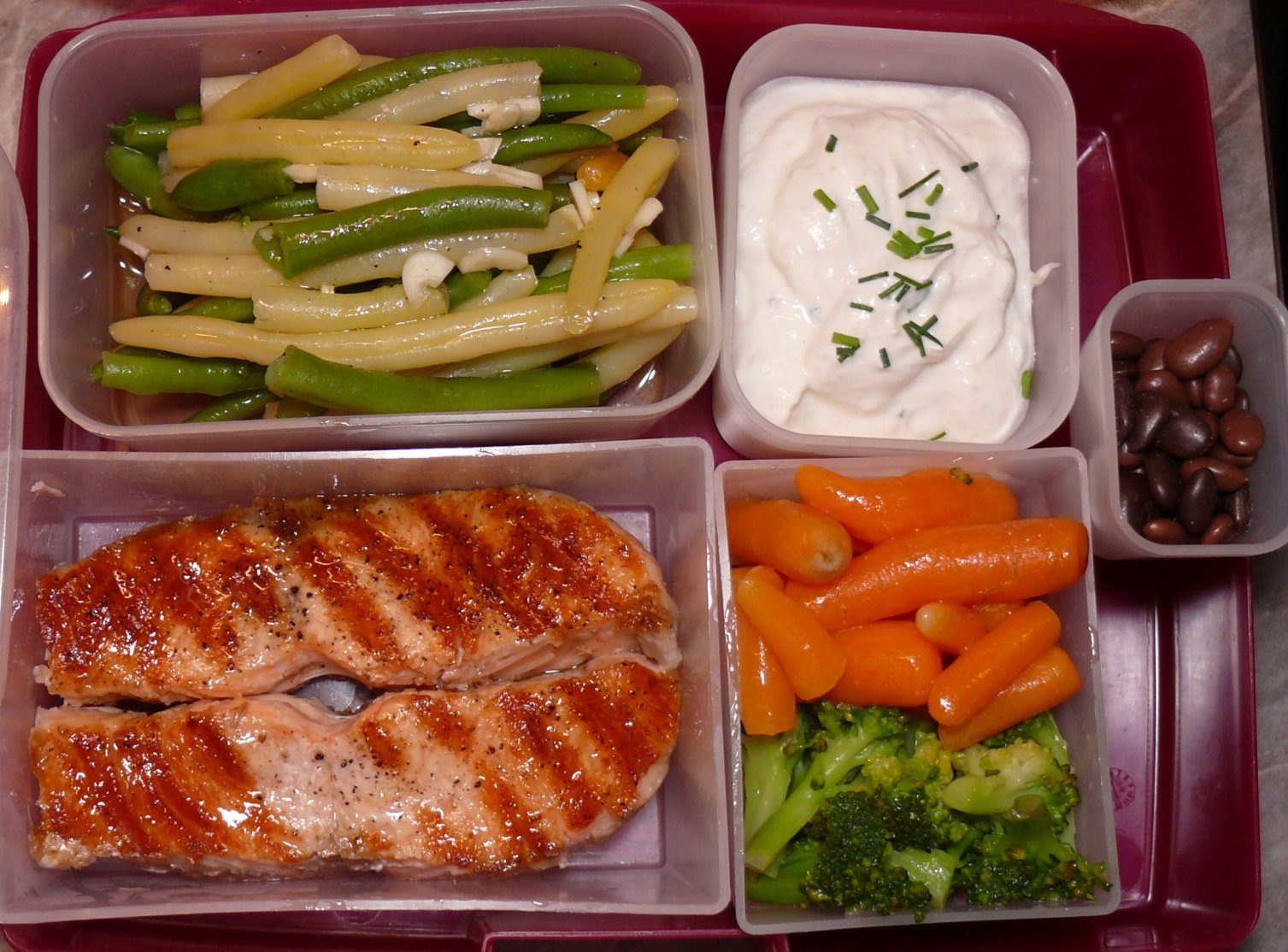 Сьомгата с морковите и броколите (които се споменаха) и салата от зелен боб с чеснов дресинг и млечен сос с див лук. Simple Smile