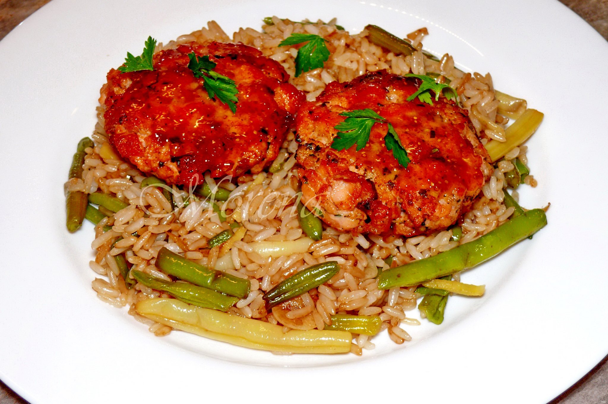 А! И с пържен ориз също... (сьомгата е на кюфтета). Simple Smile
