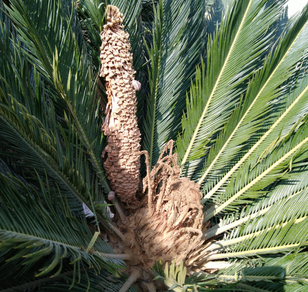 Преди да се появят семената на цикаса, има много интересно образование ( на снимката изсъхналите по високи листа. Навити са като папрати и не са така остри, като другите листа.
