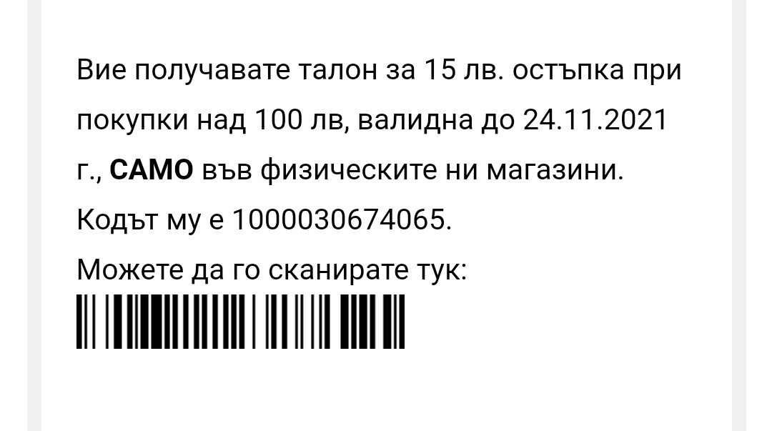 И аз имам такъв талон. Значи се гледа редовната цена на продукта, а не намалената, така ли? Мислех, че крайната цена трябва да е над 100 лв...