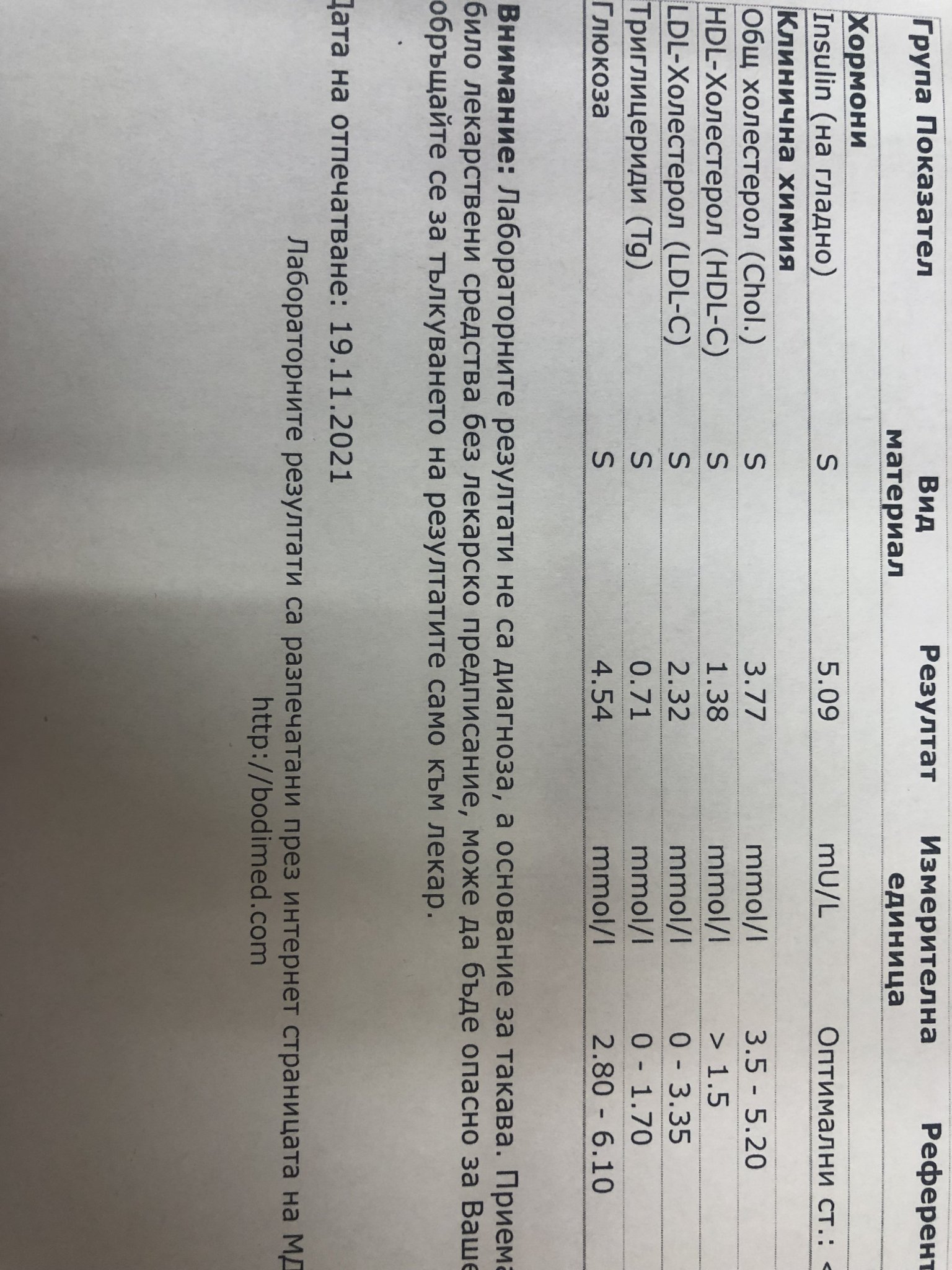 При направени изследвания миналата седмица инсулин 19.2 - коментирахме го 😀. Бяха пропуснали в лабораторията да изследват кръвната захар. Отидох на ендокринолог и т.н.