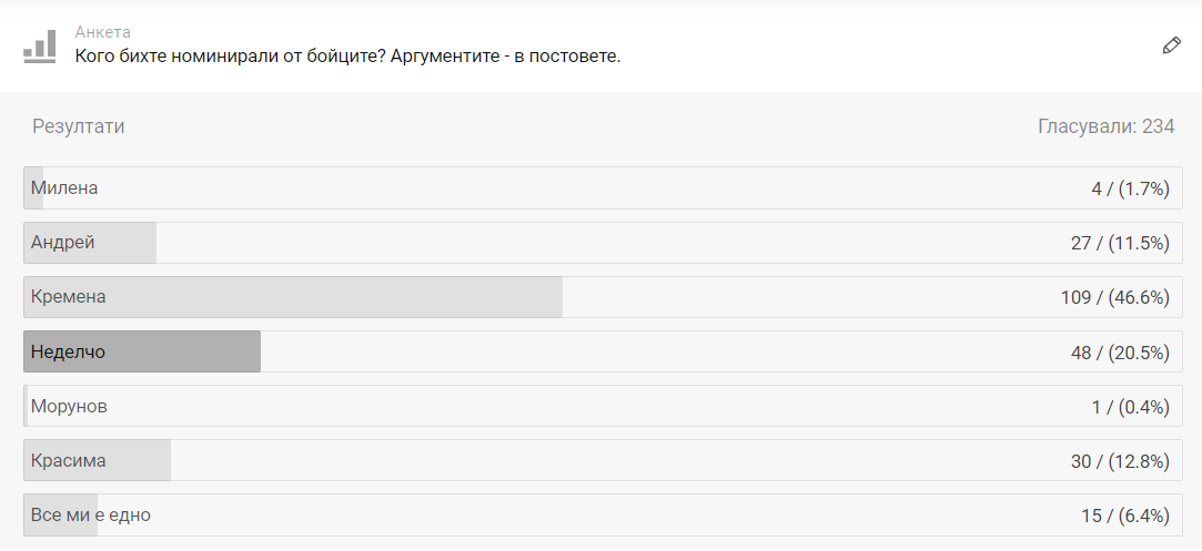 Единствено номинацията на Елизабет ми хареса. Факт, че на база игра Неделчо си заслужава номинацията, на база провалът му като капитан два пъти си я заслужава. Ако той беше срещу Красима на утрешната битка щеше да отплува с 200.