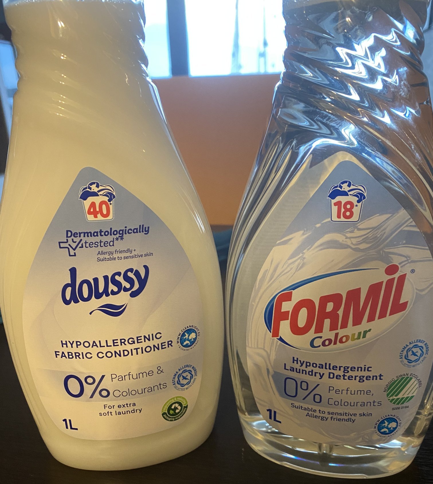 - доуси омекотител и формил течен препарат за пране без аромат и оцветител хипоалергенни по около 2 лв от литър) взех ги за олекотените завивки, защото подготвяме зимния ни дом за сезона
