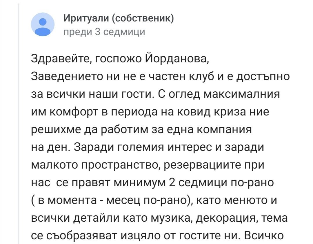 Отговор на отзива на една кандидат клиентка на Иритуали, която е направила неуспешен опит да го посети в обявеното работно време. Било е заключено, но вътре е имало клиенти.