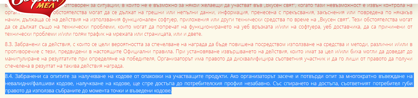 8.4. Забранени са опитите за налучкване на кодове от опаковки на участващите продукти. Ако организаторът засече и потвърди опит за многократно въвеждане на невалидни/фалшиви кодове, налучкване на кодове, ще спре достъпа до потребителския профил незабавно. Със спирането на достъпа, съответният потребител губи правото да използва събраните до момента точки и въведени кодове.