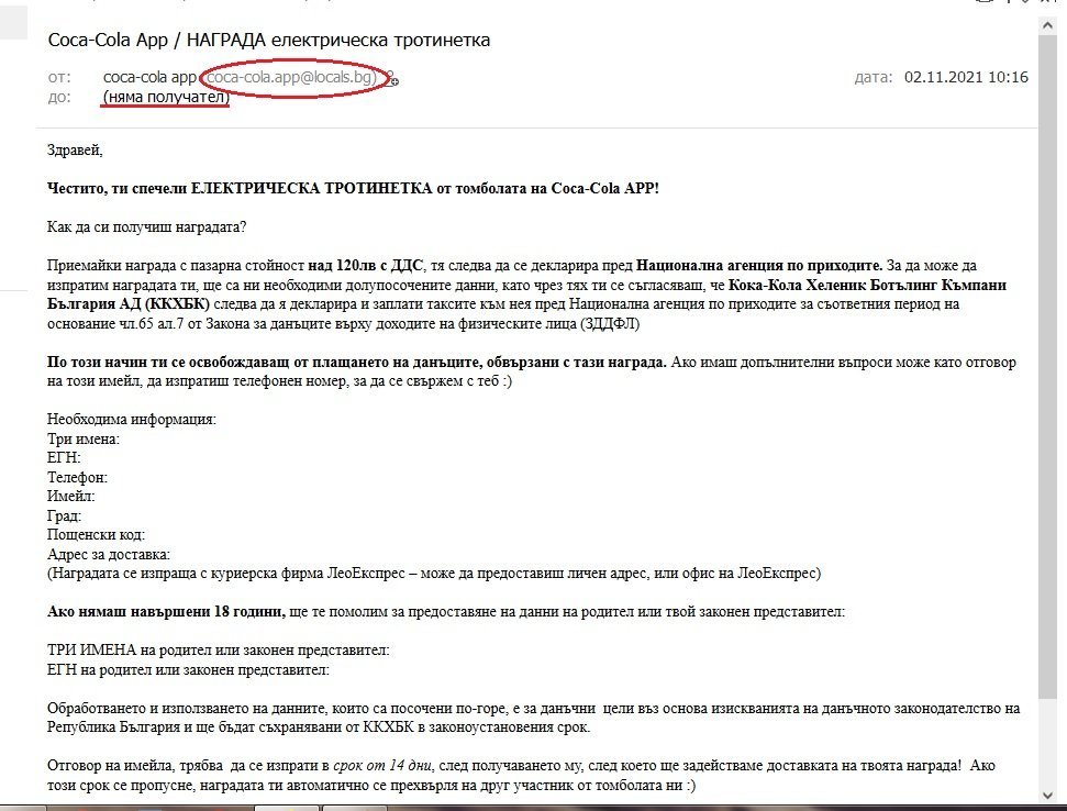 Аз получих имейл от "coca-cola.app@locals.bg", а официалният им имейл е с "тире" coca-cola-app@locals.bg