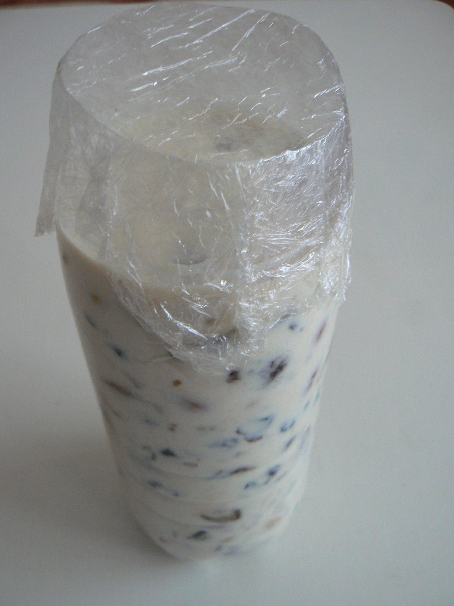 Сипва се в предварително приготвена пластмасова бутилка, на която е изрязана горната част. Вместимостта ѝ трябва приблизително да е 1100-1200 мл. Стръсква се добре, за да излезе излишният въздух и се покрива с домакинско фолио. Прибира се в хладилника за минимум 6 часа.