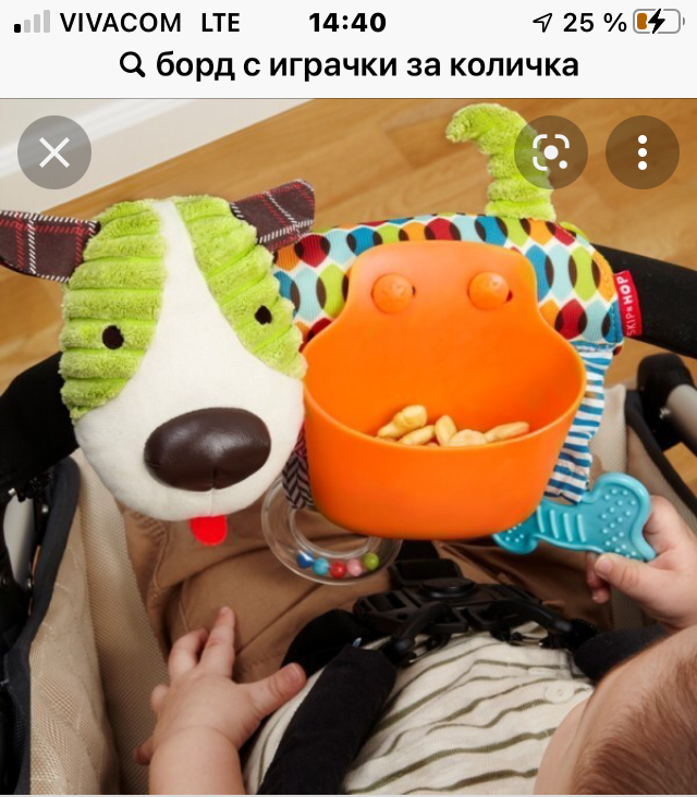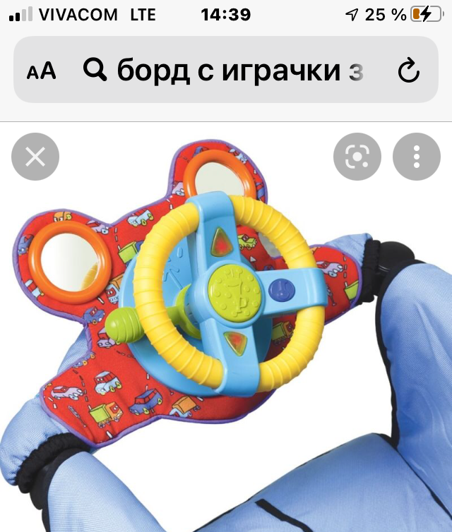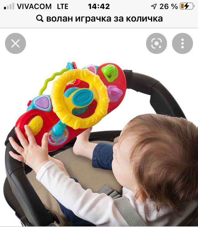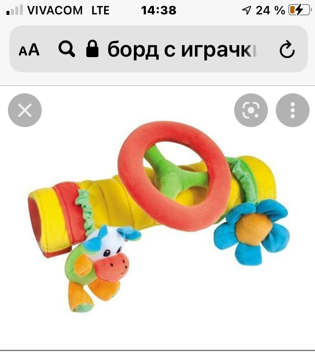 Да, пластмасово е (но пък удачно за чистене), дрънчи яко (нея я кефи, мене пък не), но ни върши работа и към момента няма желание да го гризе, че и е по-интересно да го ръчка Joy