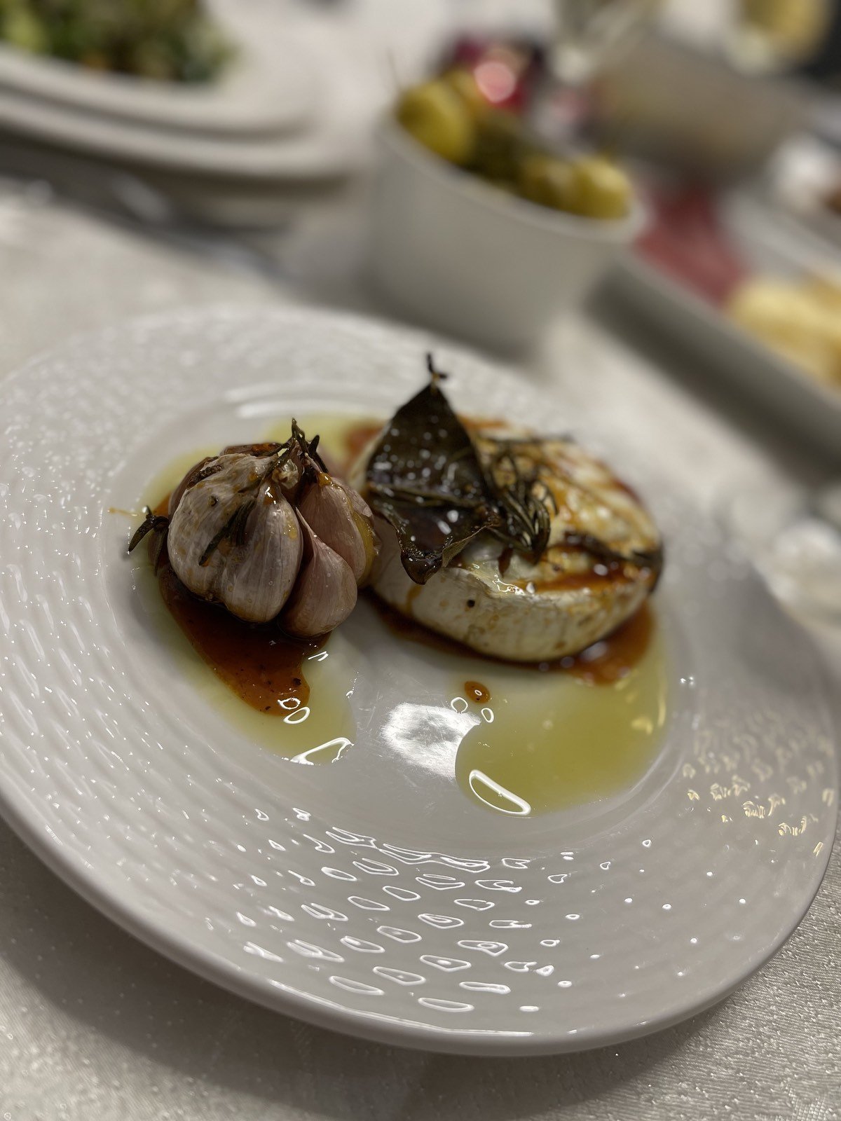 Зелена салта със сьомга, бри с мед, печен чесън и розмарин и ризото с манатарки. Вечеря за добри приятели.