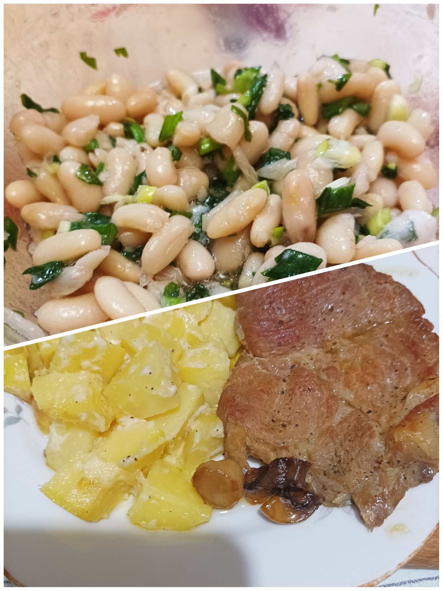 Бобена салата, вратна пържола на фурна и картофките с майонеза на karzz