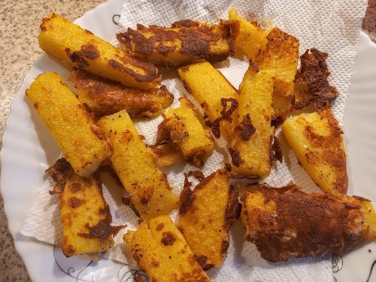 Останалия качамак опитах да направя с кашкавал на тиган, няма вид, но се яде.