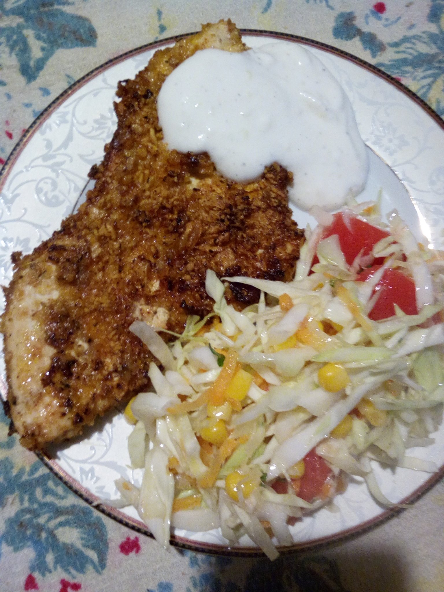 Пилешки шницели,които гледах по 24kitchen. С канела,горчица и пушен червен пипер.
