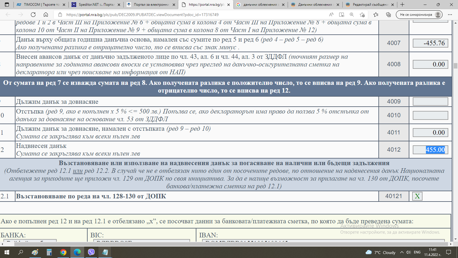 На 06.04. сутринта подадох за последен път с надеждата, че всичко е ОК, но все още нямам превод. Забелязах само едно нещо, което леко ме озадачава. В Част 4, точка 12 - Надвнесен данък, нали би трябвало да се визуализира сумата от 450 лв (за едно дете)? На мен там ми излиза 455лв. Да не би тук нещо да съм объркала... ?