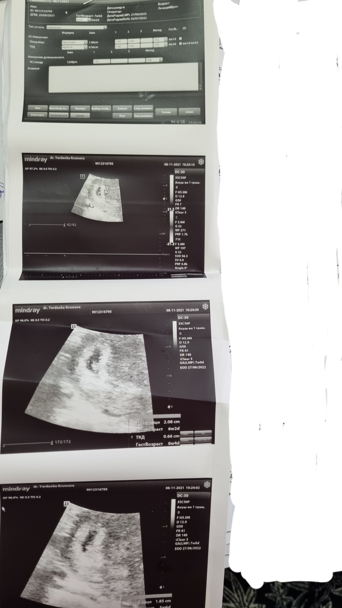 На 29.10 бях на преглед, видя се малко сакче и АГ ми каза, че отговаря на ранна 5-та седмица или преди 5-та, но не ми каза с точност. Хем се зарадвах, че вижда бременност, хем се притесних, защото според приложението вече бях в 6-та. Каза, че според него е вътрематочна и изследванията са добре. Извика ме след 2 седмици.