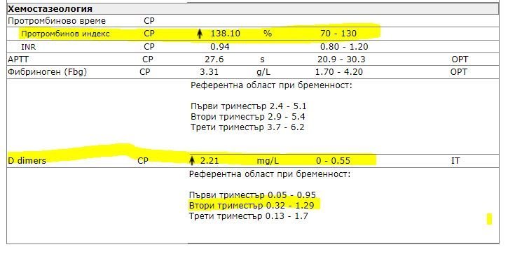 Днес пуснах някои изследвания препоръчани от др Сигридов, във втори триместър съм бременна. Има завишения в 'Протромбиново време' и D dimers, но не знам дали е нещо притеснително. Не приемам никакви лекарства тип аспирин, клексан или друго. CRP и Ferritin са ми в норма.