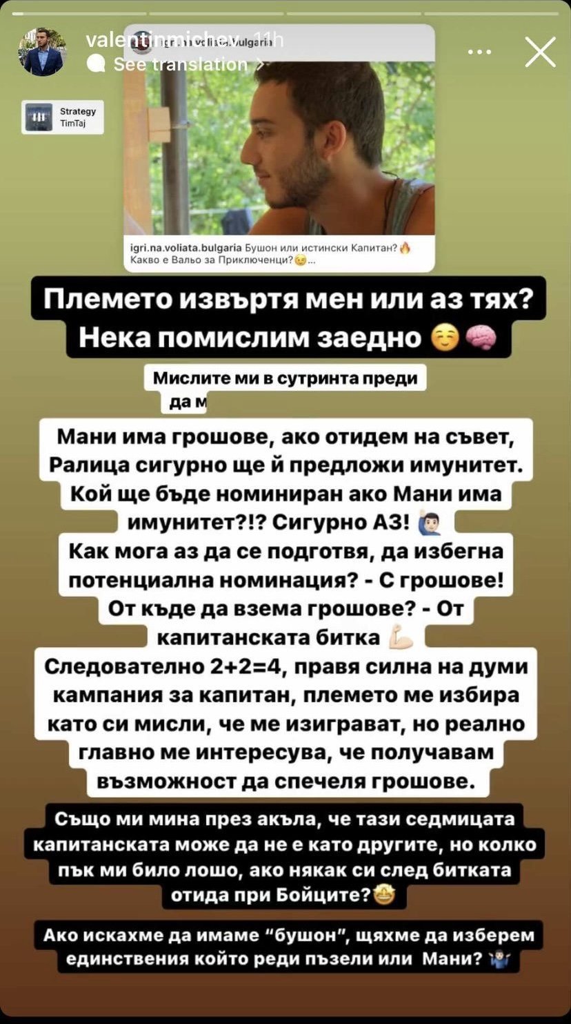 Идеалният ми сценарий за довечера е Неделчо и Елизабет да са излъгали. Неделчо директно на номинации, а Валентин взема всички грошове на Елизабет. Мечти, мечти...