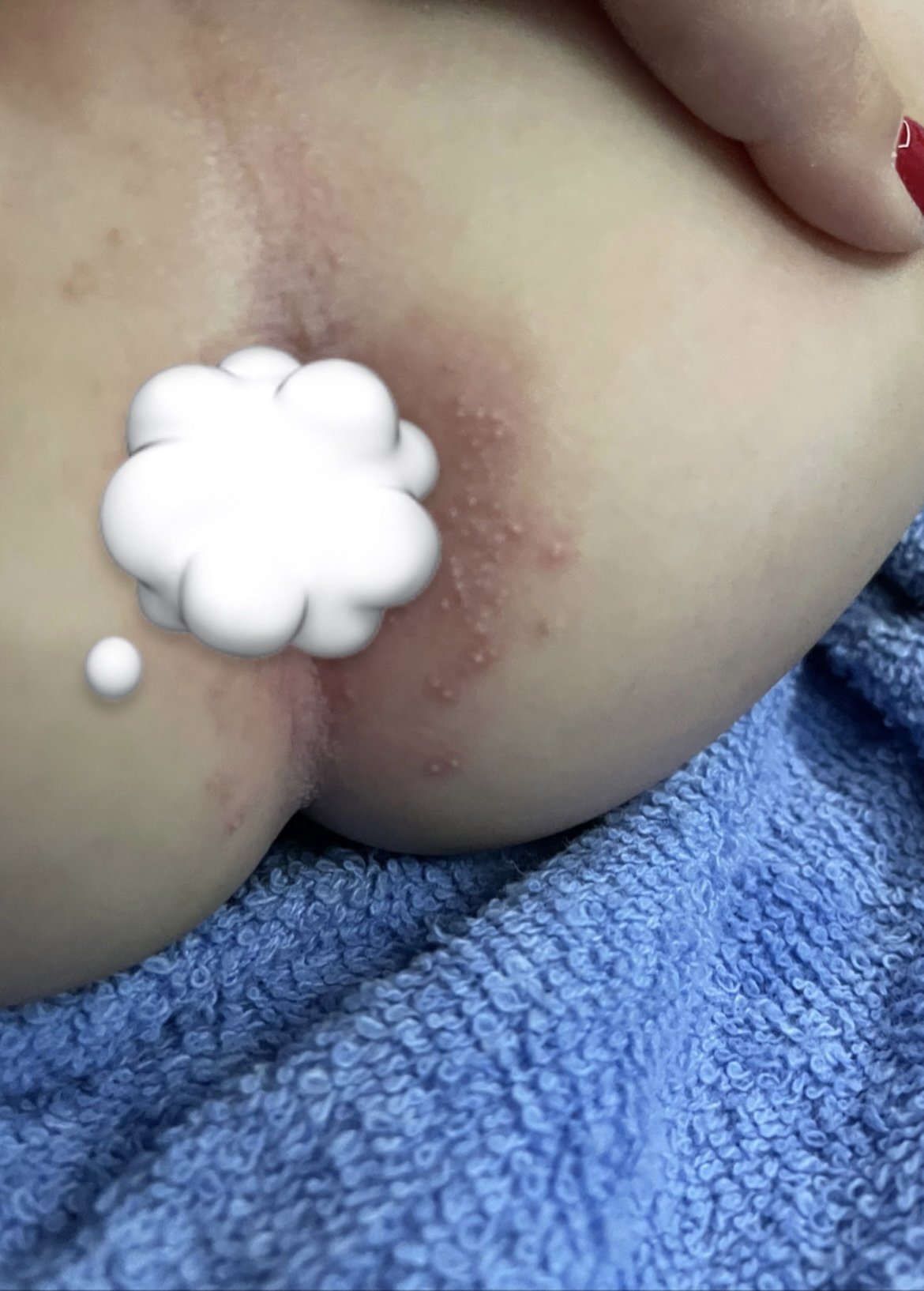 Подсечено прюс вероятно гъбички, обикновено съм чела,че изписват клотримазол крем, но това вече след лекарски преглед.Правете бани със смрадлика, повече да диша кожата на въздух на чаршафче по голо дупе, миене, без мокри кърпи, джинджира може,както и ако имате някоя мостра, имаше един подсушаващ лосион Цителиум.