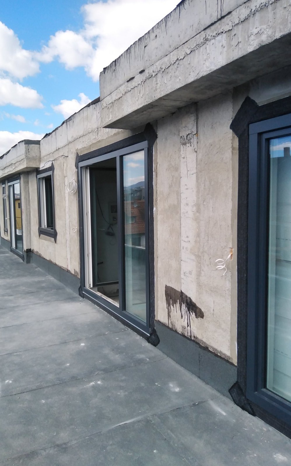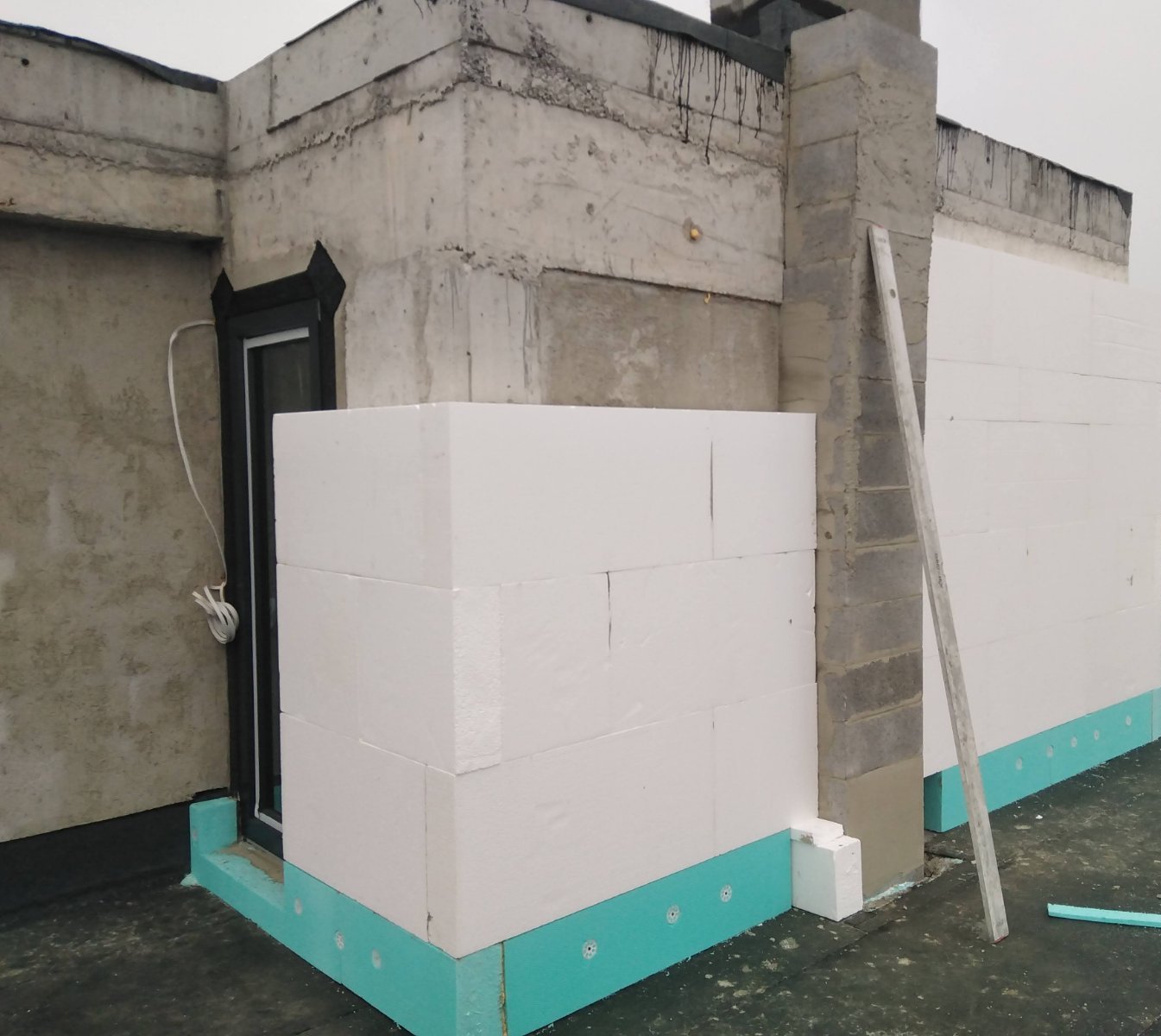 Преди да монтираме изолацията налепиха хидроизолация по стените долу и после XPS, EPS и пак XPS на козирките (бетона).
