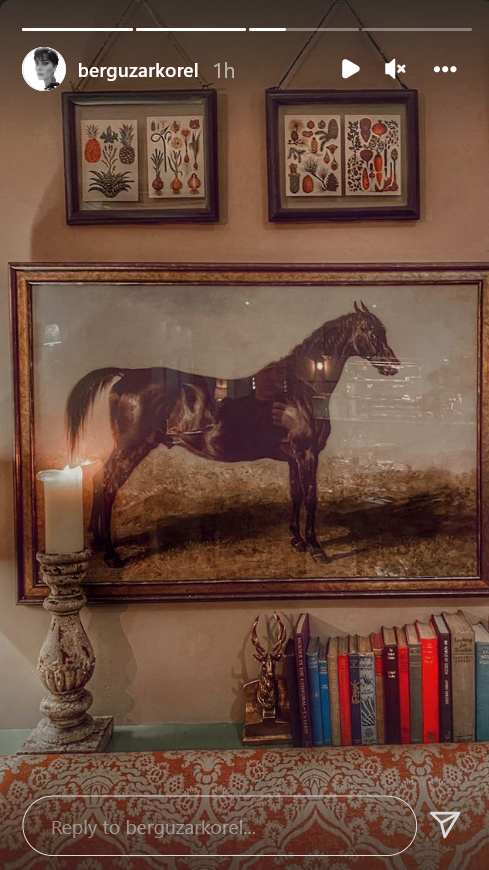 Малко повече информация от вчерашната снимка от Берг Joy Отраженията върху снимката на картината с коня. Добре се виждат ръката на Берг с телефона, лицето ѝ, зад гърба ѝ, до рамото е Хан на столчето край масата. Отсреща може би е Халит или Али. Жалко, че конят не е по - голям - щеше да се вижда повече и с по - добра резолюция.