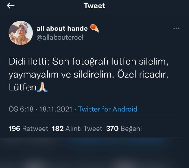 Снимката е била качена в профила на Мая, от майка й и след това изтрита. Ханде не искала тази снимка да се разпространява, приятелката й Дилара излязла със съобщение да се прекрати разпространяването и тагването на името й.