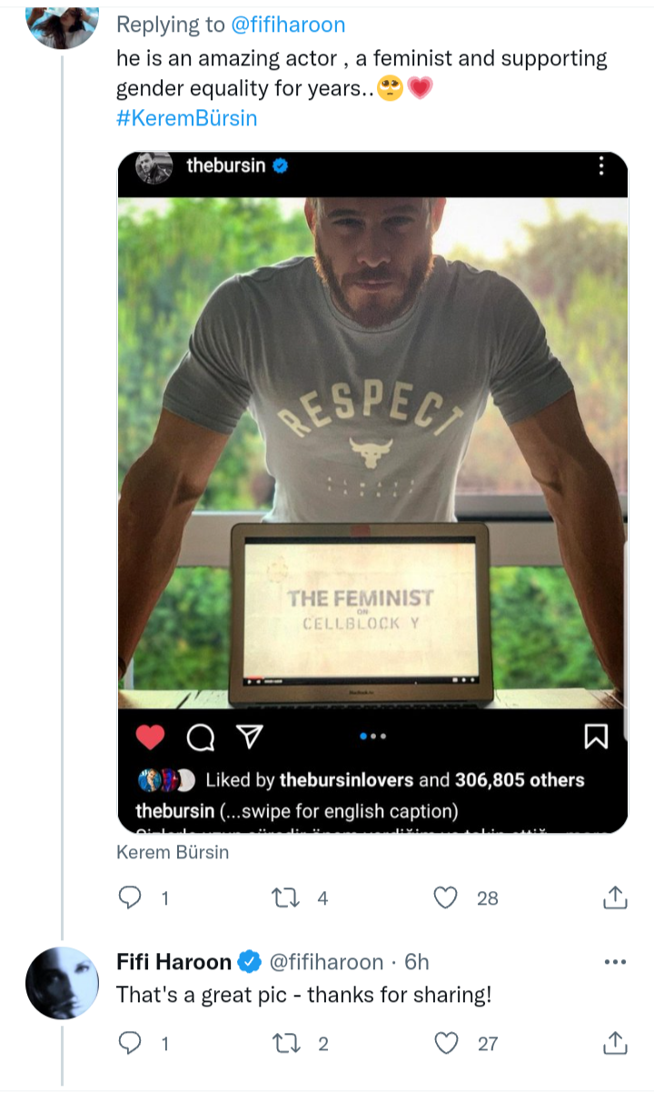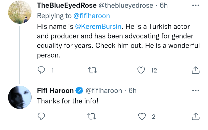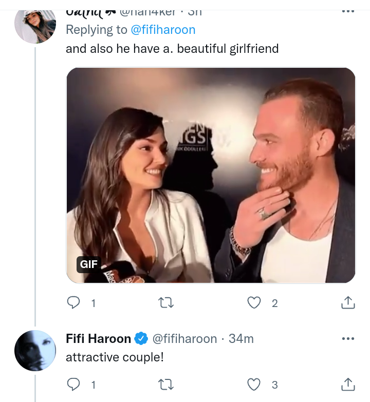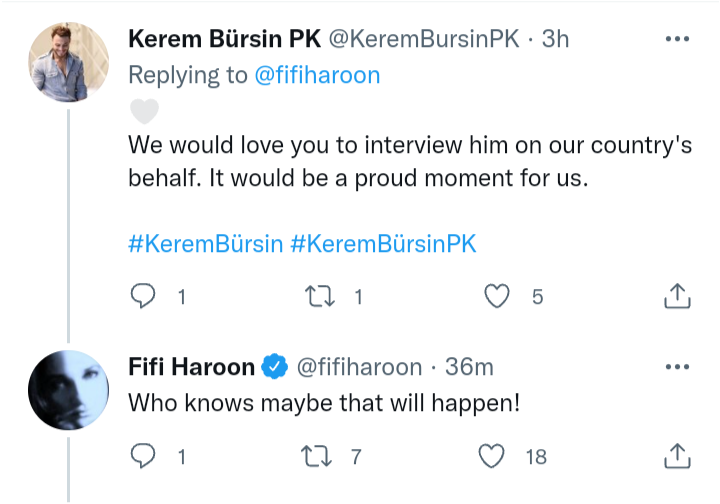 Една английска журналистка Фифи Харун от ББС радио мисля, е споделила в Туитър пост с Керем и под него фенове я информират за това кой е, откъде е и с какво се занимава и тя и им отговаря. Така, че скоро може и интервю по ББС да слушаме 😉 Явно го е харесала Фифи 🤫