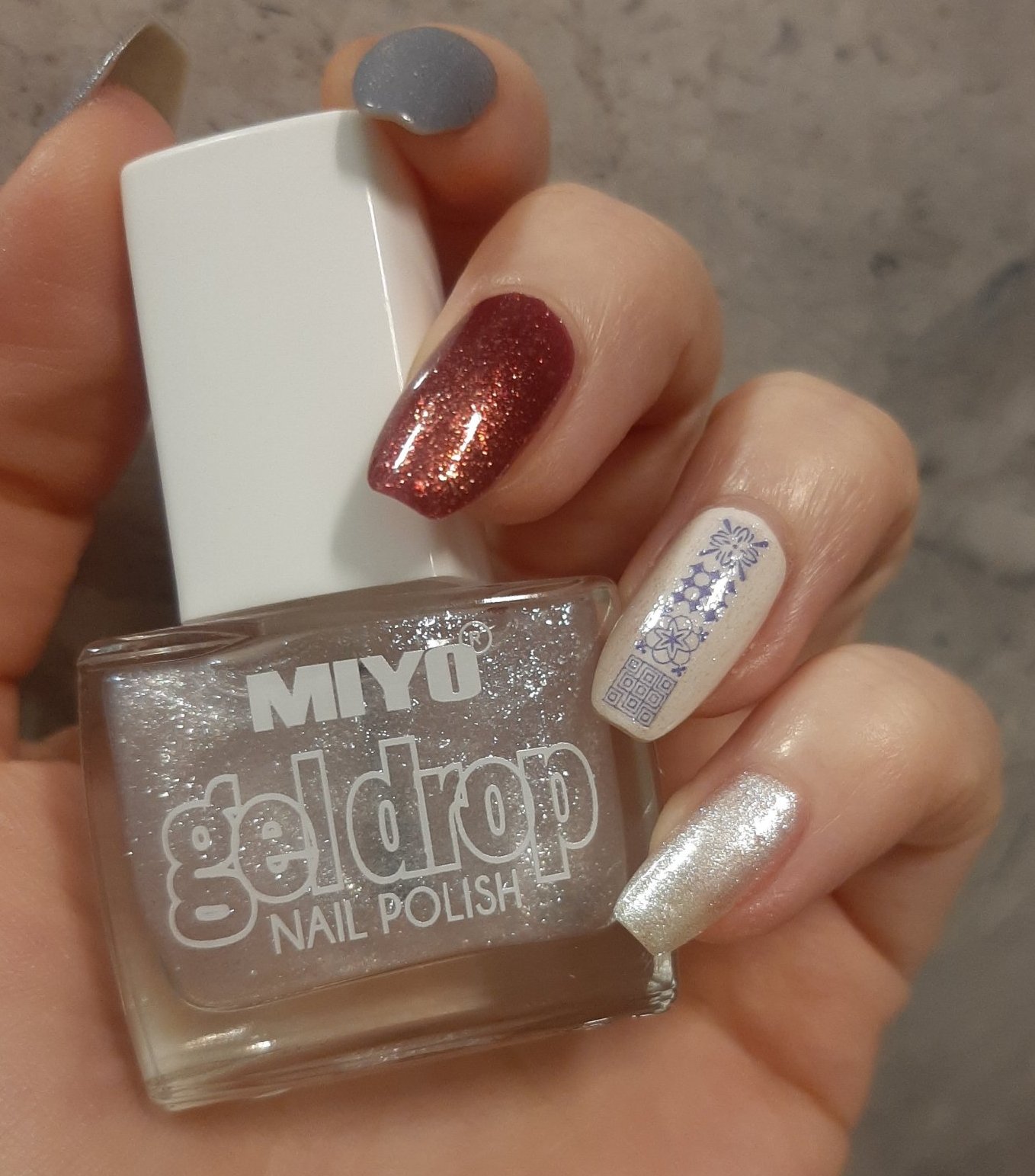 Констанс Карол 79 (мини), Евелин 01, Miyo 07 (този е само с лек ефект, очаквах да е по-млечен). Тук КК е на 3 слоя, малко прозира, а Евелин на 2.