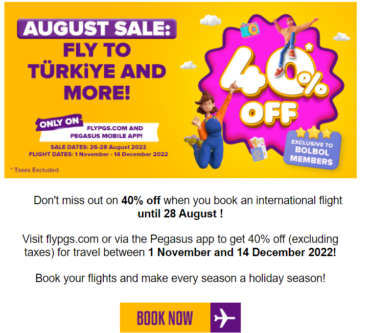 Turkish Airlines предлага разнообразие от дестинации и промоции. Някои интересни предложения включват нови полети на Pegasus до Иран за $50 в посока, вътрешни полети в Турция за 6 евро, международни промоции като полет до Казахстан за 160 евро двупосочен и полет до Батуми, Грузия, за 30 евро еднопосочен. Turkish Airlines обикновено прави промоции около Нова година, Свети Валентин и двата Байрама.