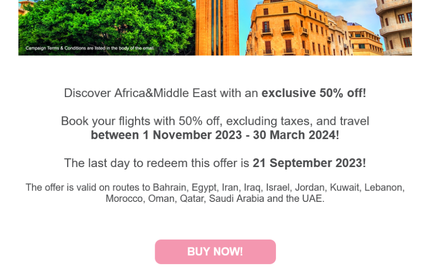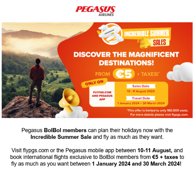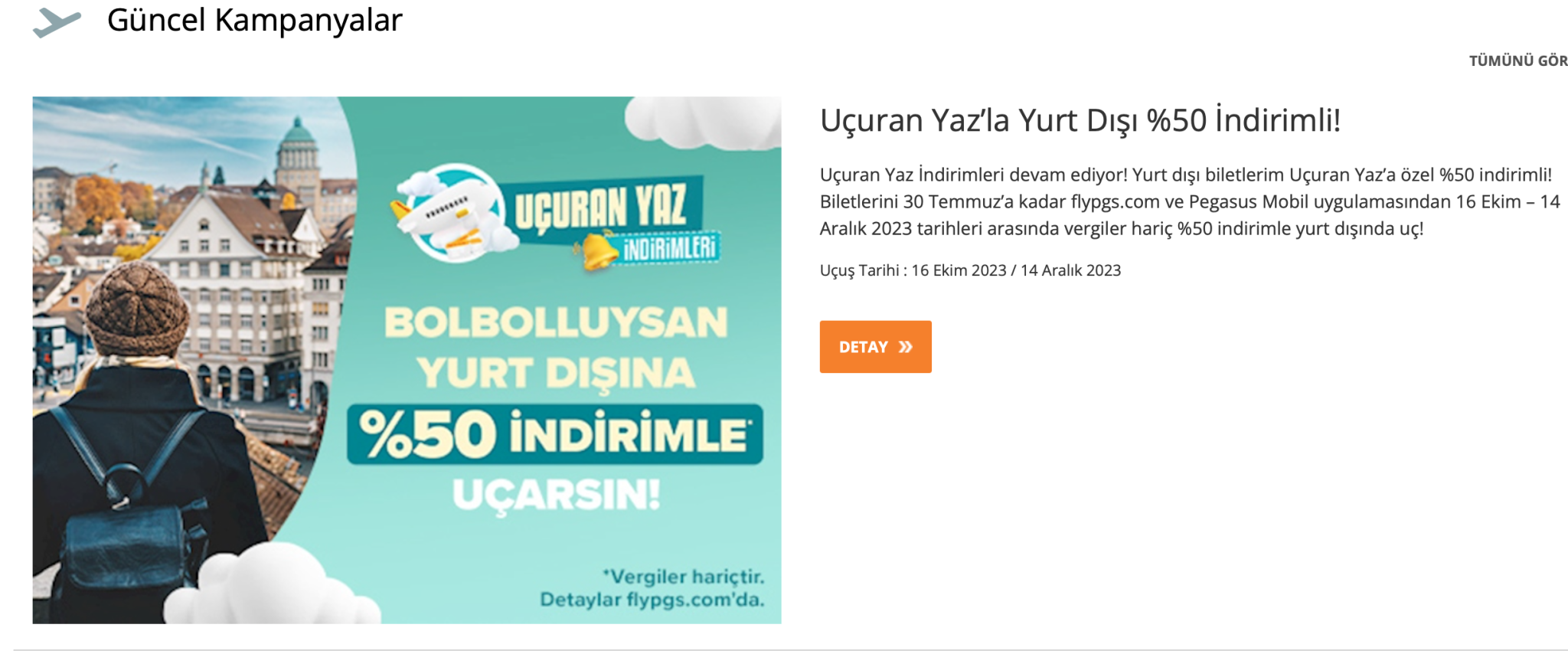 Turkish Airlines предлага разнообразие от дестинации и промоции. Някои интересни предложения включват нови полети на Pegasus до Иран за $50 в посока, вътрешни полети в Турция за 6 евро, международни промоции като полет до Казахстан за 160 евро двупосочен и полет до Батуми, Грузия, за 30 евро еднопосочен. Turkish Airlines обикновено прави промоции около Нова година, Свети Валентин и двата Байрама.